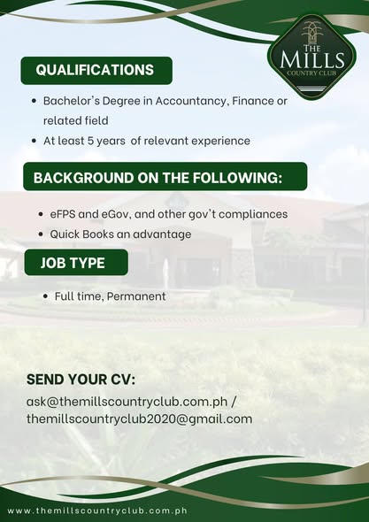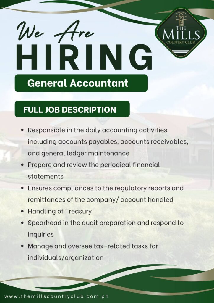 #NowHiring #GeneralAccountant #AccountingJobsPH #HiringPH #JobOpportunity #AccountingCareers #CareerGrowth #CanlubangArea #TheMillsCountryClubInc #CarmelrayPark1