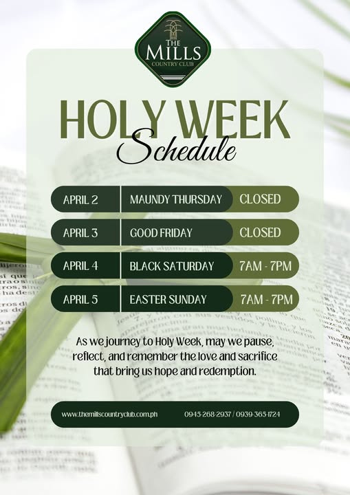 As we observe the solemnity of Holy Week, please be guided by our club schedule.